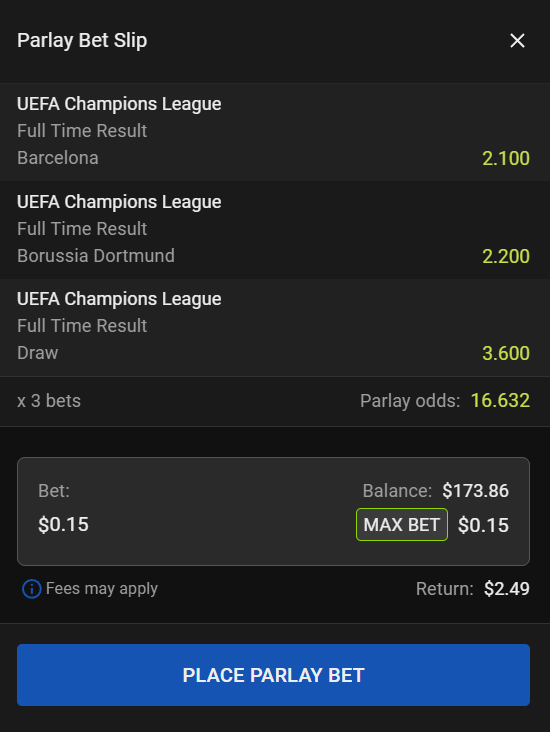 Users can add up to 8 money line, full time result or over/under bets in a single parlay.&#x20;