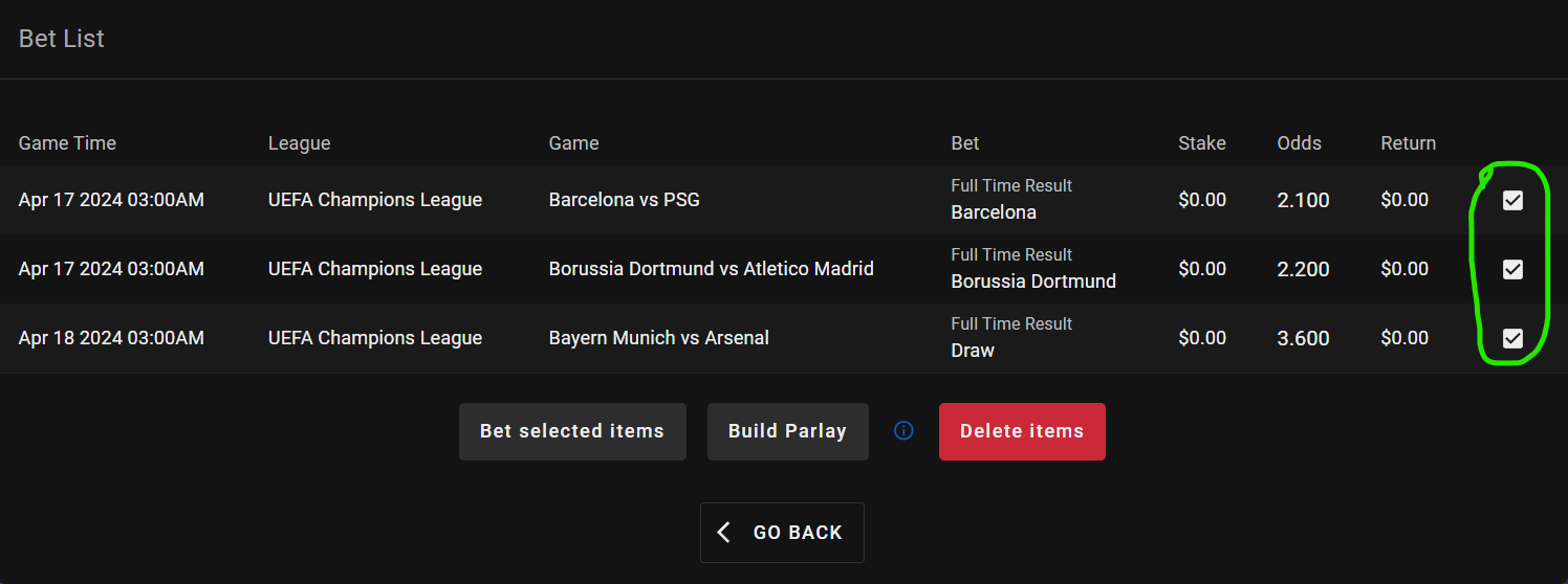 In the Bet List, checkmark the desired events for the parlay and click "Build Parlay"