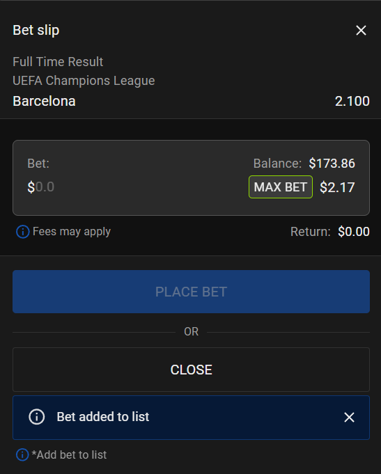 To add events for parlay betting, click on desired events and "Add to bet list".