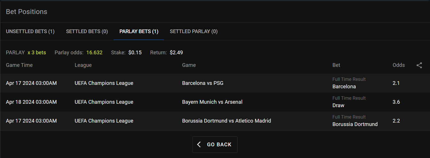 When the parlay is confirmed it will show up in "Positions" under "Parlay Bets" until it is settled.&#x20;